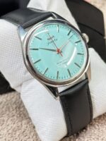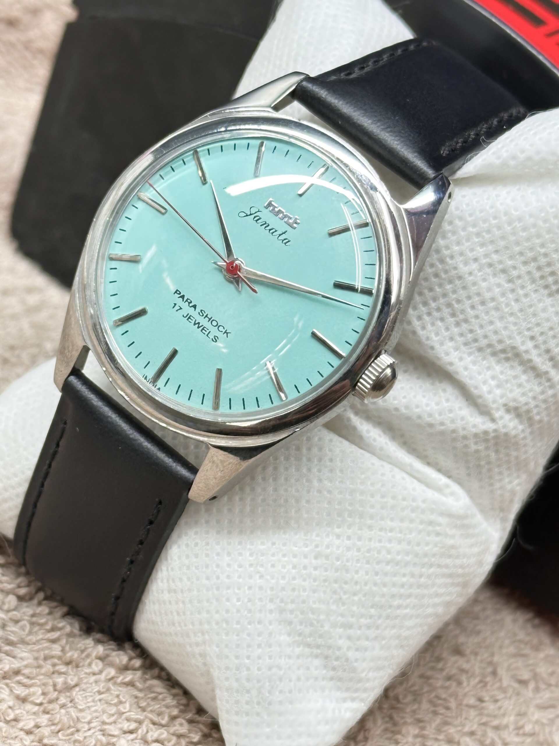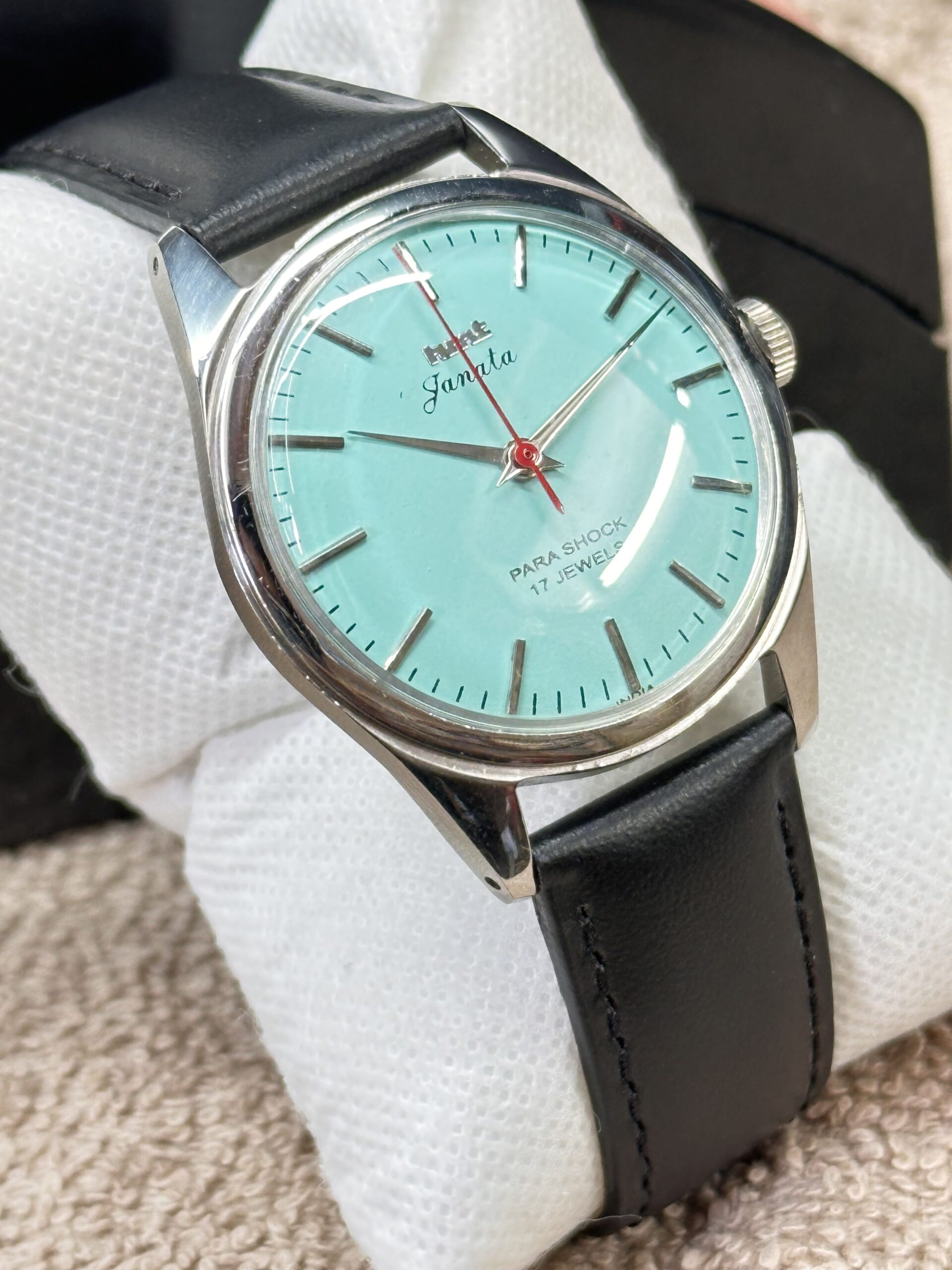 The standout feature of this watch is its elegant Tiffany-colored dial, delivering a unique and sophisticated appearance that enhances both casual and formal styling. The clean and legible dial layout reflects the iconic simplicity of the HMT Janata series, making it an excellent choice for daily wear as well as special occasions. Complementing the dial is a high-quality black faux leather band, adding comfort, durability, and a classic touch to the overall design.