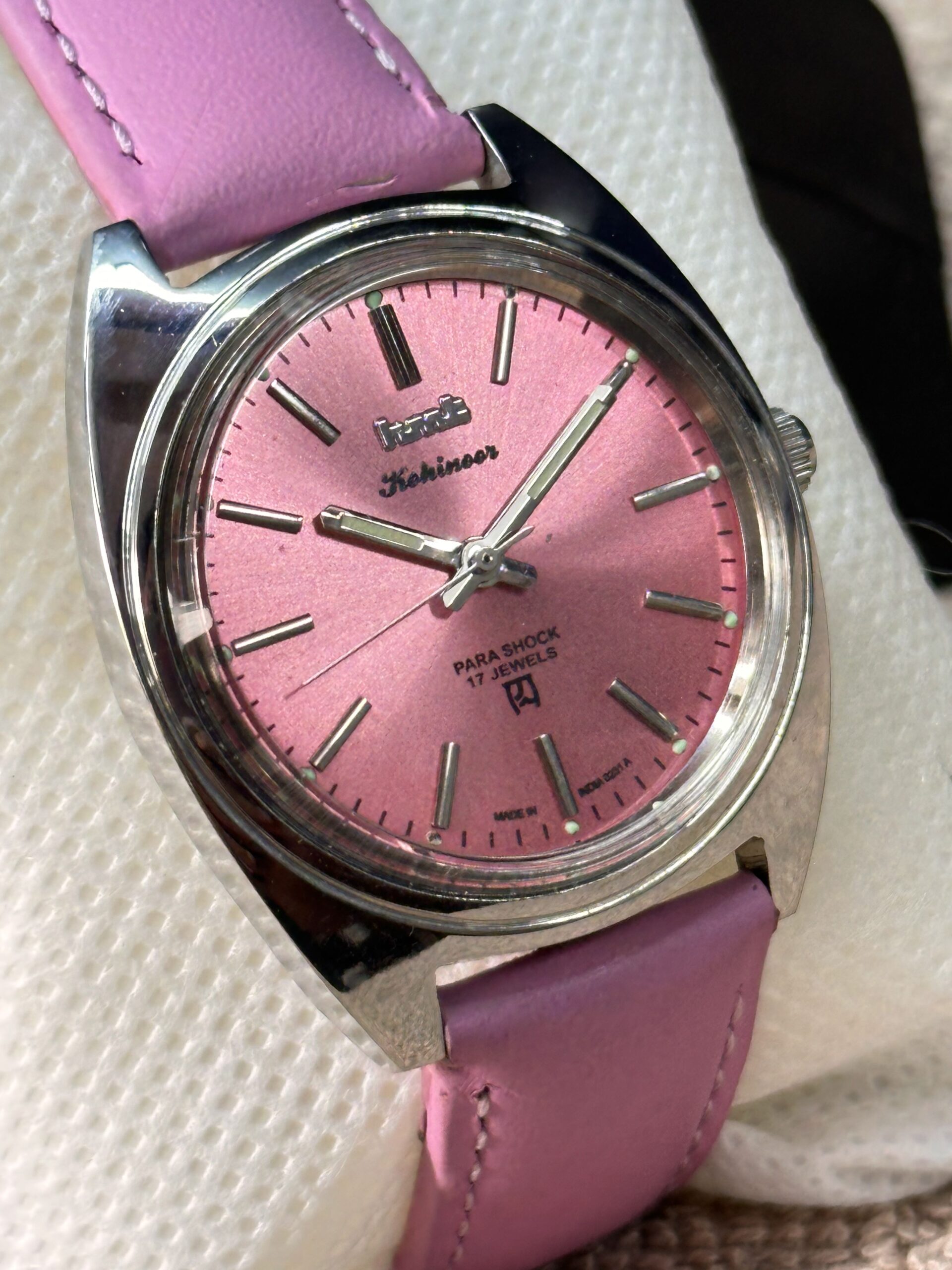 Introducing a distinctive and collectible HMT Kohinoor men’s wristwatch, a vintage mechanical timepiece admired for its timeless craftsmanship and classic design heritage. This elegant watch features a unique pink dial color combined with a polished silver stainless steel case, creating a stylish and eye-catching appearance suitable for casual, classic, and dress/formal occasions. The balanced dial layout ensures clear readability while preserving the authentic vintage aesthetic that collectors and mechanical watch enthusiasts value.