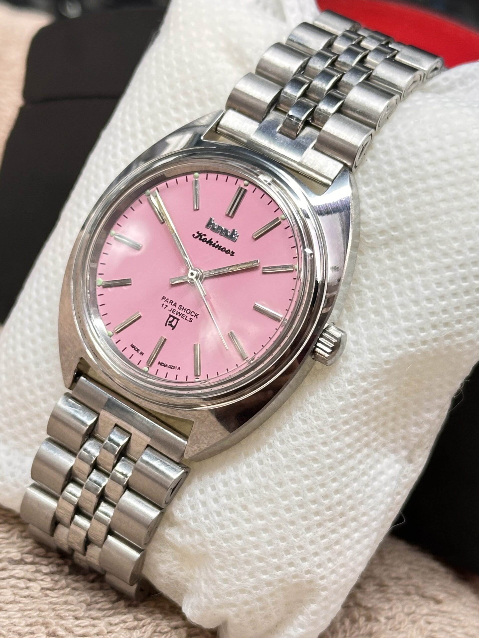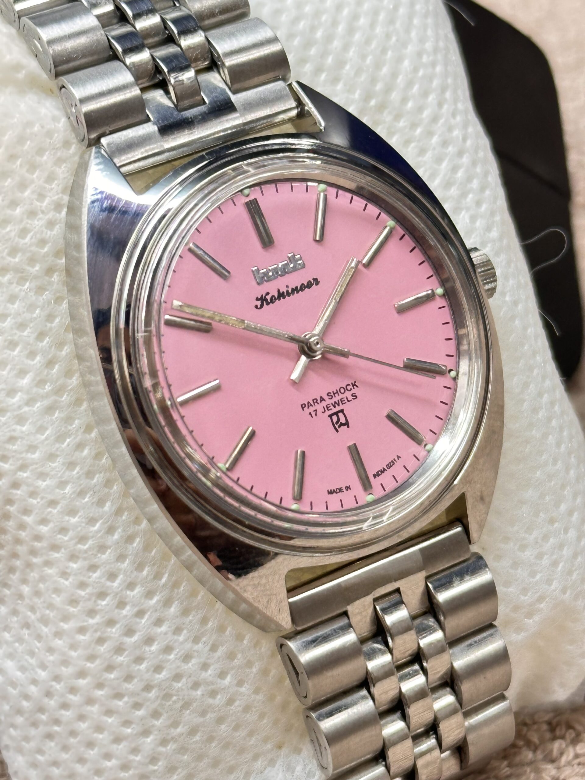 The distinctive pink dial enhances the visual appeal of the watch while maintaining excellent readability and a refined vintage aesthetic. Paired with a strong and stylish silver stainless steel band, this timepiece delivers durability, comfort, and timeless design suitable for casual, classic, and dress/formal styles. With a 40mm lug width, the watch ensures balanced proportions and a secure fit for a wide range of wrist sizes. Designed specifically as a men’s vintage wristwatch, this HMT Kohinoor reflects the legacy of Indian watchmaking and remains highly desirable among collectors searching for a vintage HMT Kohinoor, pink dial vintage watch, 17 jewels mechanical watch, hand winding vintage watch, or a classic men’s stainless steel dress watch.
