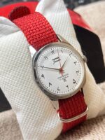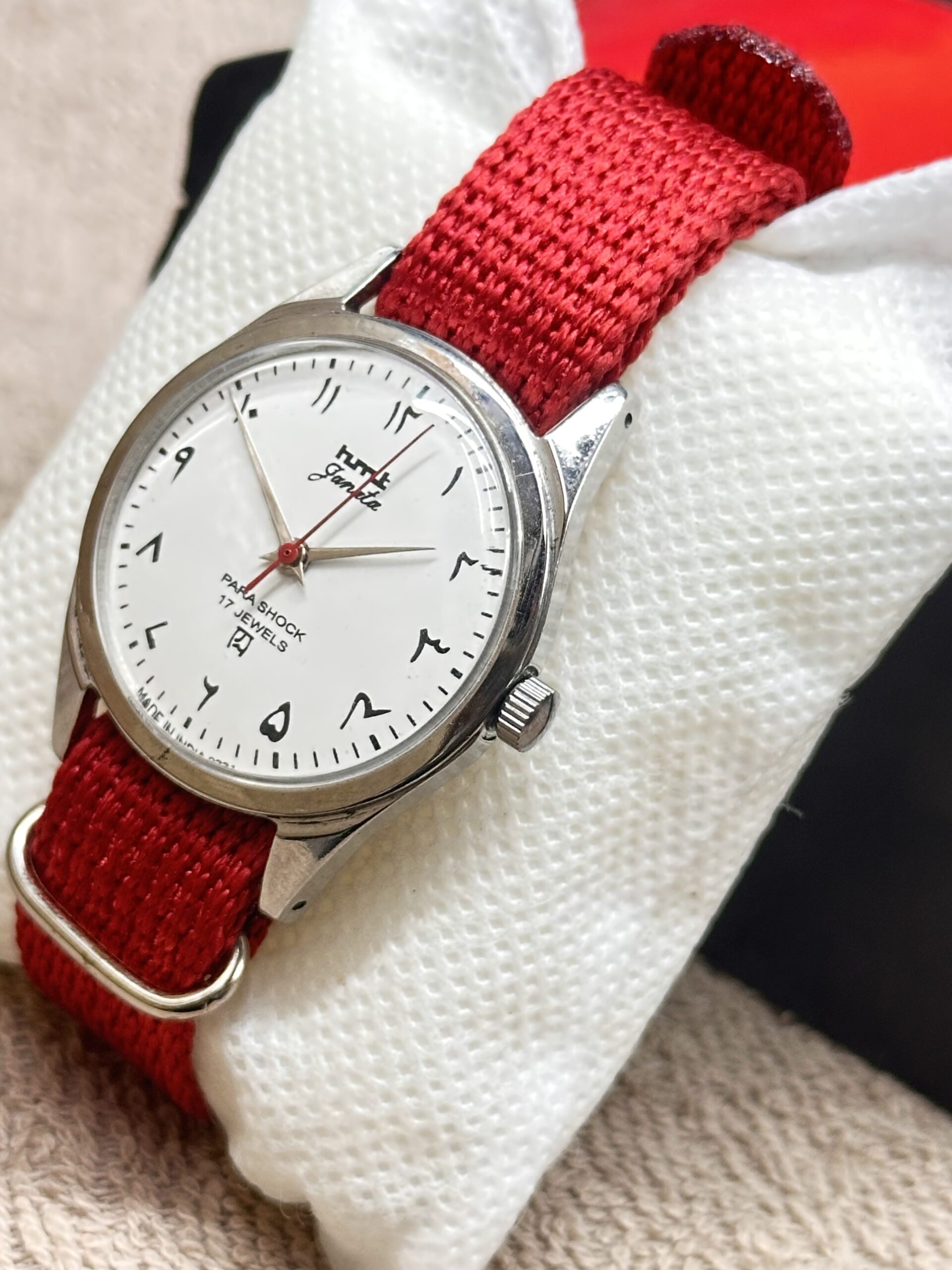 Presenting an authentic Vintage HMT Arabic 17 Jewels Hand Winding Men’s Watch, a classic Indian mechanical timepiece admired by collectors and vintage watch enthusiasts worldwide. This genuine vintage watch represents traditional horology and timeless craftsmanship, offering a reliable hand winding mechanical movement known for durability, precision, and long-lasting performance. Designed with a stainless steel silver case and a clean white dial featuring Arabic numerals styling, this watch delivers a refined vintage appearance suitable for casual wear, classic outfits, and dress or formal occasions. The distinctive red nylon band provides both comfort and a bold retro aesthetic, making it a unique everyday accessory for men who appreciate heritage mechanical watches.