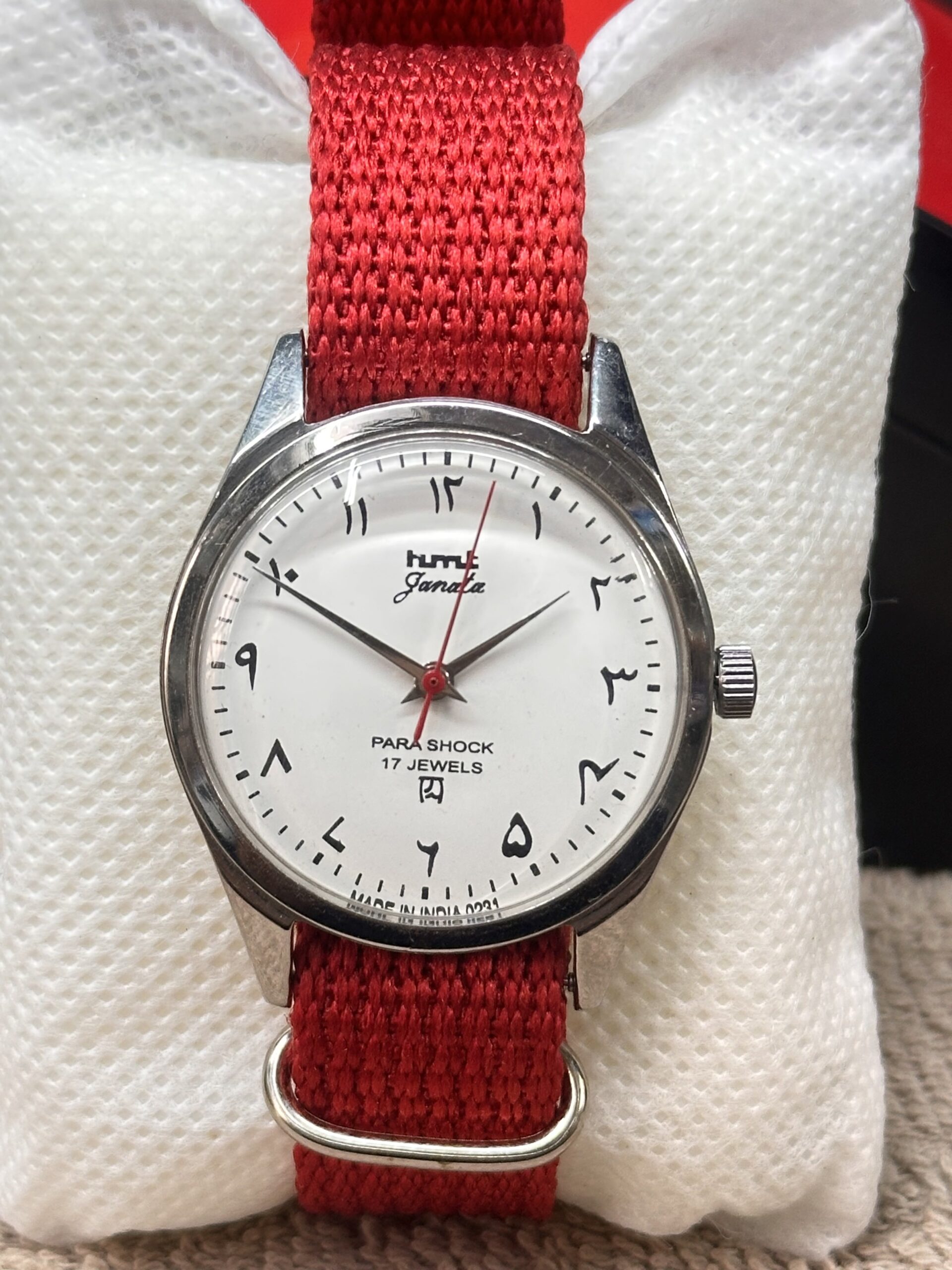 Brand: HMT, Model: HMT Arabic, Jewels: 17 Jewels, Movement: Hand winding mechanical, Case Material: Stainless Steel, Gender: Mens, Case Color: Silver, Band Material: Nylon, Band Color: Red, Dial Color: White, Case Size: 36mm excluding crown, Lug Width: 40mm, Style: Casual Classic Dress Formal, Country of Manufacture: India. Every word of specification listed is included to ensure accurate representation for collectors and buyers seeking a true vintage HMT mechanical watch.