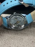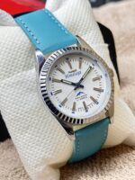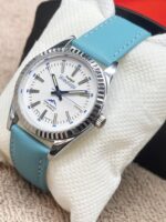 The silver stainless steel case pairs elegantly with the minimal white dial, delivering a refined and classic vintage aesthetic. The watch is fitted with a comfortable blue faux leather band that enhances its visual appeal while providing a distinctive retro style. Powered by a traditional hand winding mechanical movement with 17 jewels, this timepiece delivers the authentic mechanical experience valued by vintage collectors and analog watch lovers who appreciate heritage and craftsmanship.