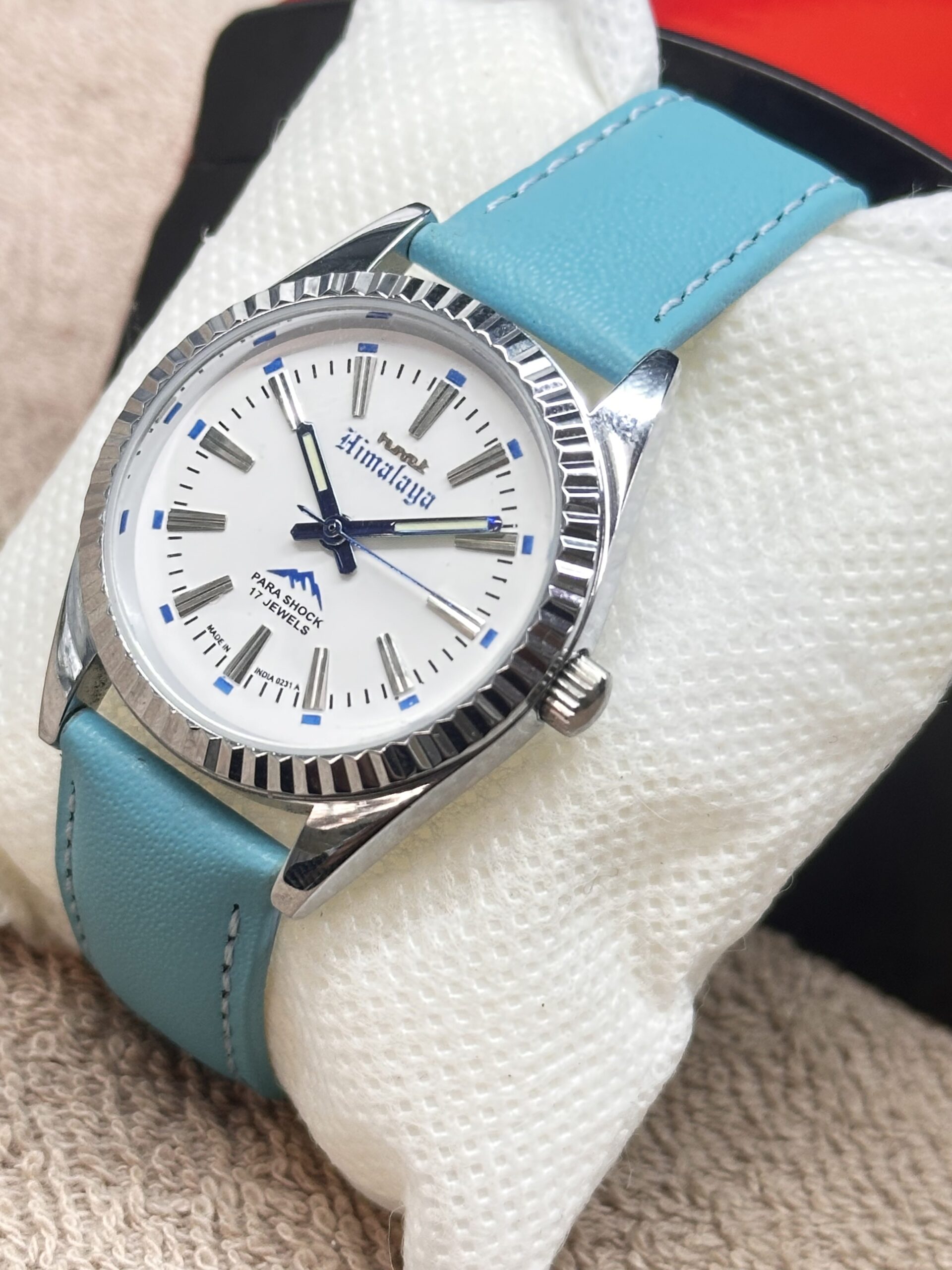 Brand: HMT. Model: HMT Himalaya. Jewels: 17 Jewels. Movement: Hand Winding Mechanical. Case Material: Stainless Steel. Gender: Mens. Case Color: Silver. Band Material: Faux Leather. Band Color: Blue. Dial Color: White. Case Size: 36mm excluding crown. Lug Width: 40mm. Style: Casual, Classic, Dress/Formal. Country of Manufacture: India.